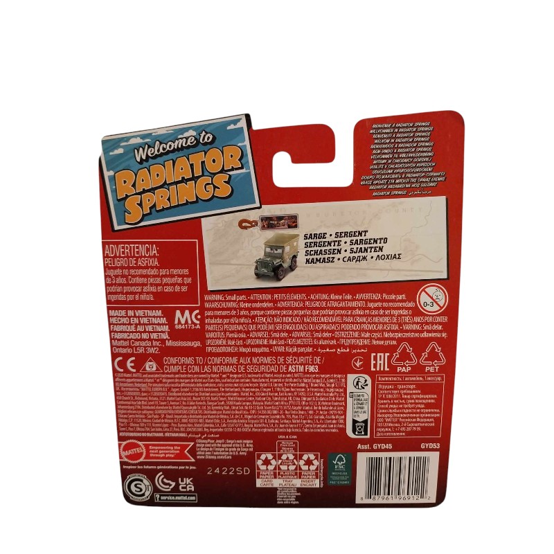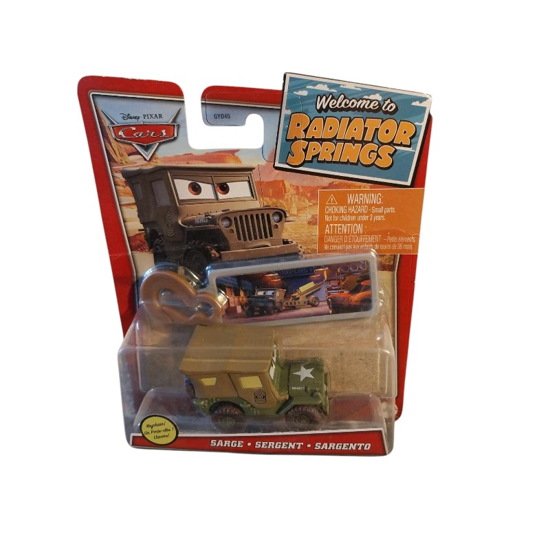 Le Cars Radio Springs Sarge est un jouet inspiré du personnage Sarge de la série Cars. Ce jouet en forme de voiture est fait en plastique et métal, capturant fidèlement l’apparence de Sarge.