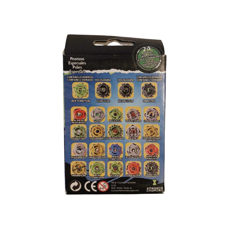 Chaque toupie représente un alien différent, comme Swampfire, Big Chill, ou Humungousaur, avec des designs détaillés et colorés. Les toupies sont conçues pour tourner rapidement et être lancées dans des arènes de combat, où elles peuvent s’affronter dans des batailles épiques.